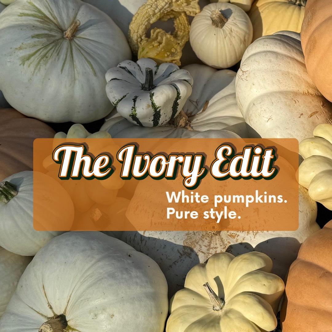 The Ivory Edit is a curated collection of white and ivory-toned pumpkins in a variety of sizes and textures. Soft, serene, and effortlessly chic, this package brings a clean, elevated look to any porch or entryway. It's fall decor with a modern twist and just the right amount of softness.