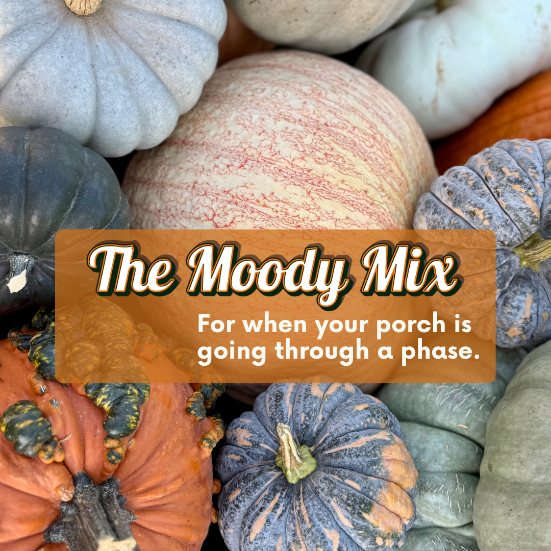 Deep tones. Bold vibes. The Moody Mix is your go-to for a darker, more dramatic take on fall decorating. This collection features richly colored pumpkins in moody greens, stormy grays, and velvety oranges - all artfully mismatched to create that perfectly undone, effortlessly cool look. It's the kind of decor that sets a tone.
